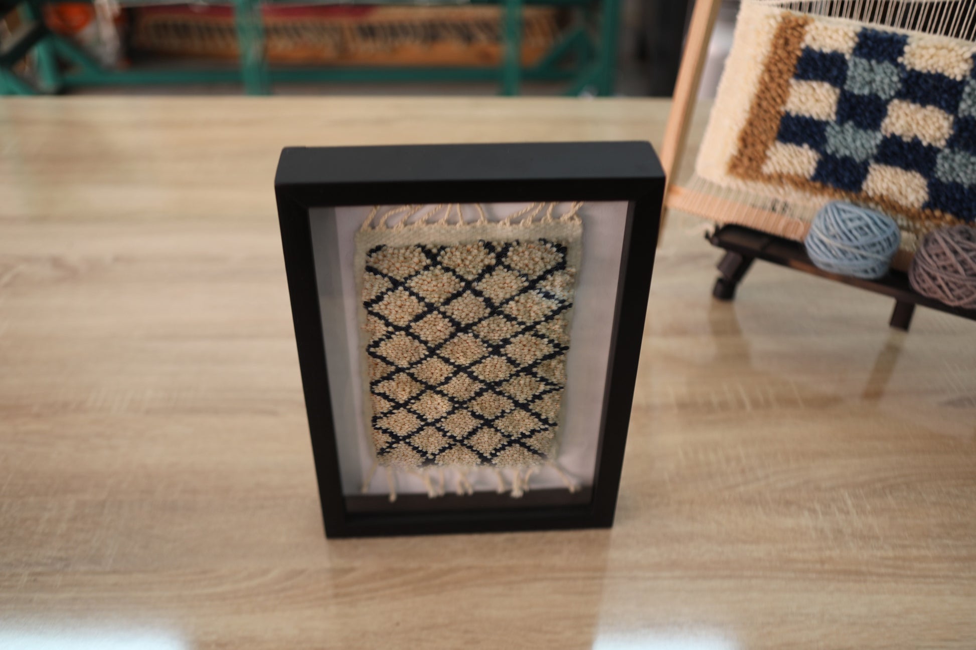 Every thread tells a story. With rich tones of black and cream. and a pattern of zigzag Berber patterns., each miniature rug is made knot by knot using traditional Moroccan weaving techniques.