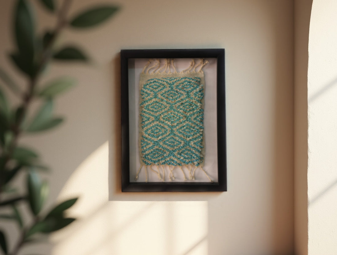 Framed Hand-Knotted Moroccan Mini Rug – Lattice Geometric Green Art (25x31 cm) Add texture, meaning,...