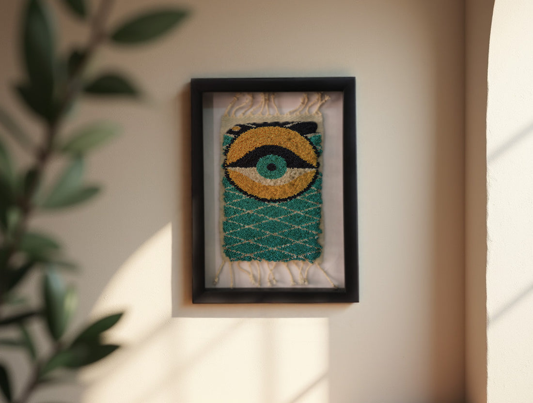 Bold Yellow Evil Eye Moroccan Rug – Framed Wall Art for Protection & Style