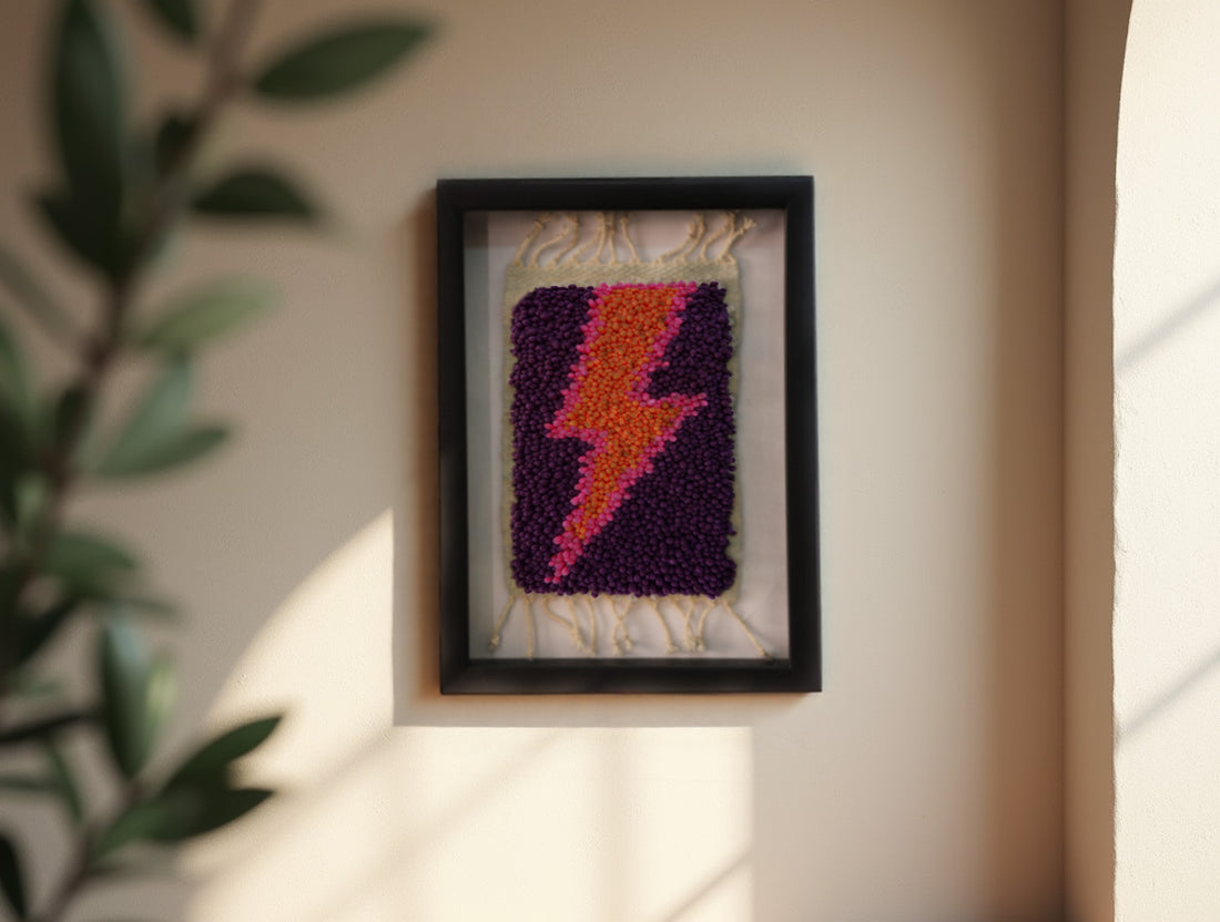 Bold Lightning Bolt Wall Art – Framed Mini Moroccan Rug (25x31 cm, Hand-Knotted Wool)
