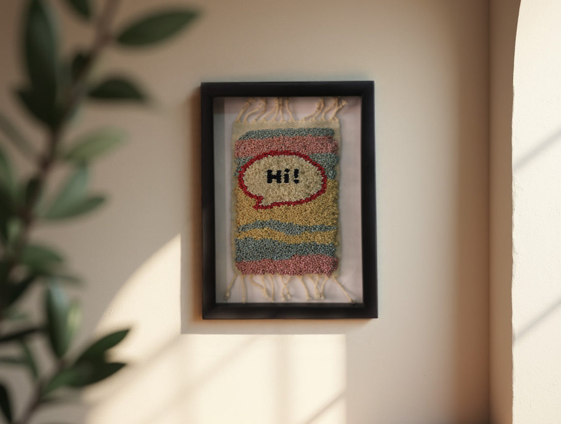 🎨 Colorful “Hi!” Speech Bubble Moroccan Rug Wall Hanging – Framed Textile Decor Bring personality...