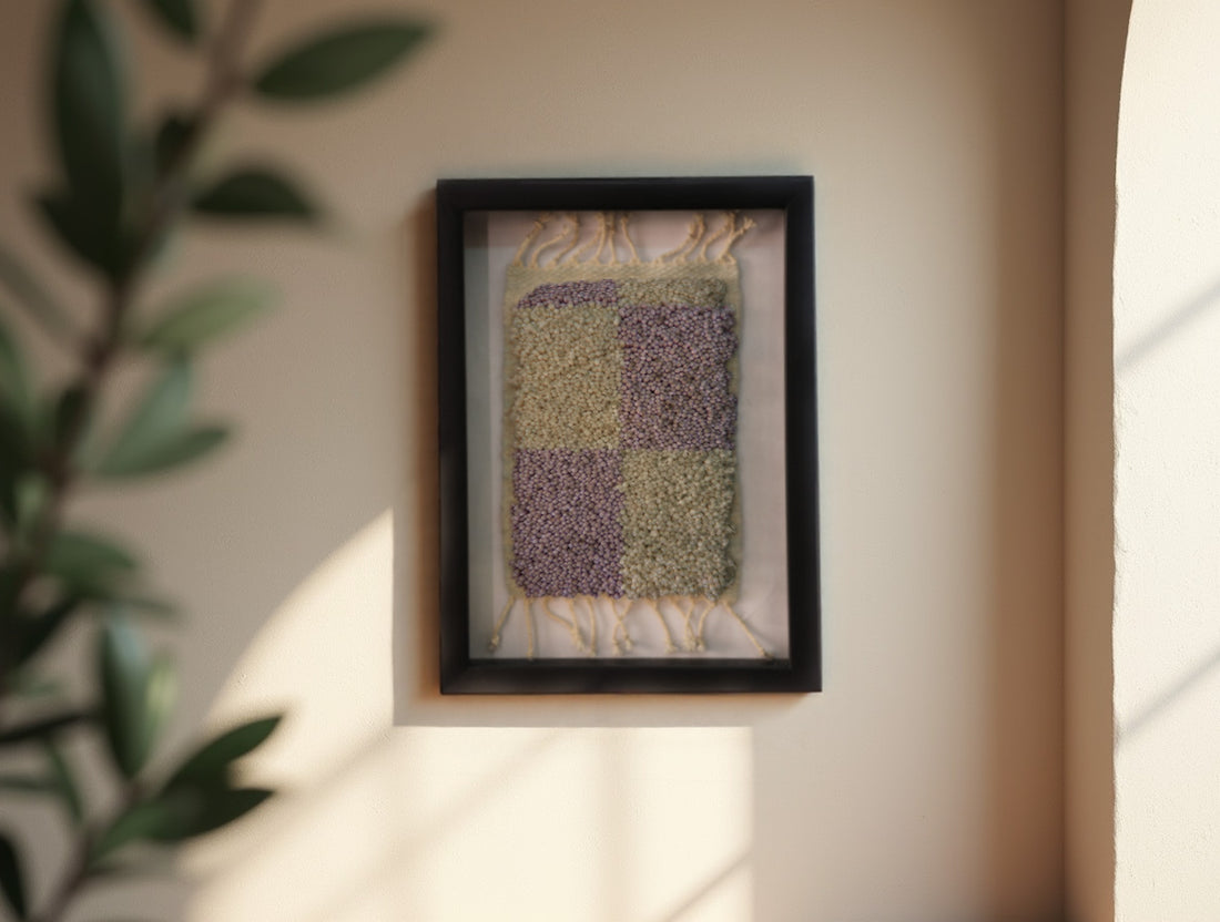 Patchwork Harmony – Hand-Tufted Framed Fiber Art in Lavender & Sage | Modern Textile Wall Deco