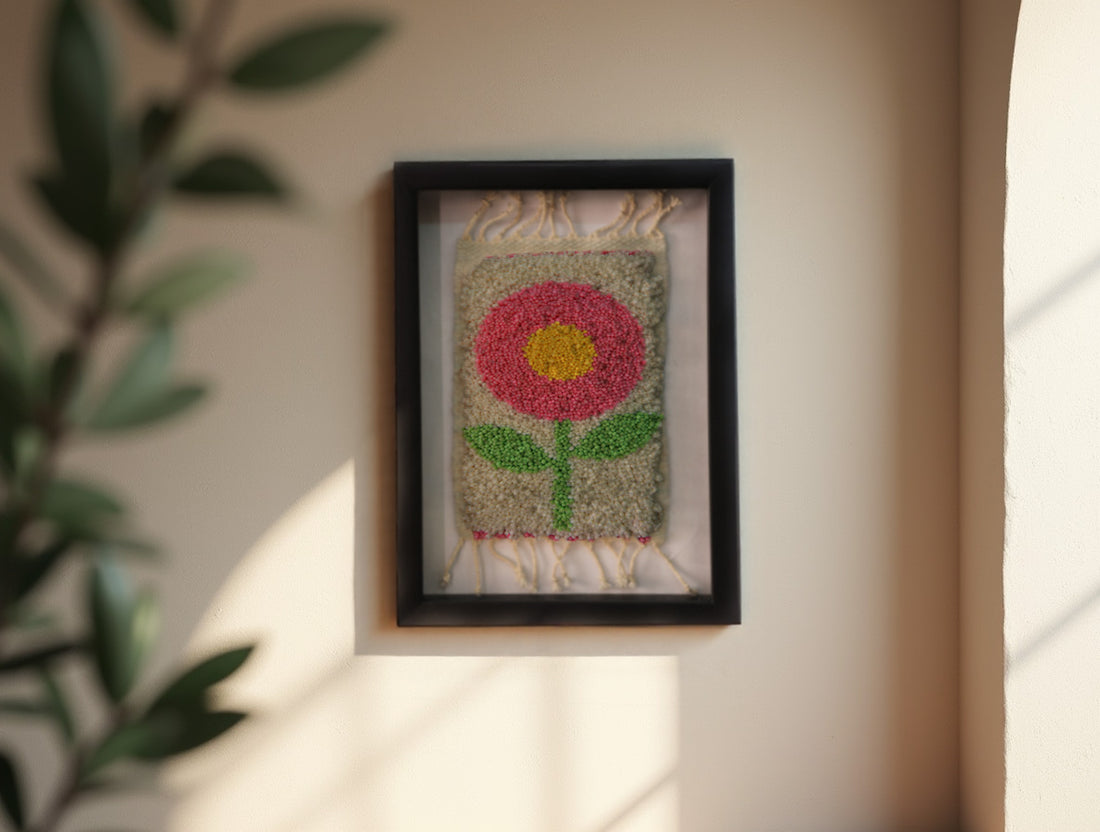 Pink Flower Moroccan Rug Wall Art – Hand-Knotted Wool Framed Tapestry (25x31 cm)