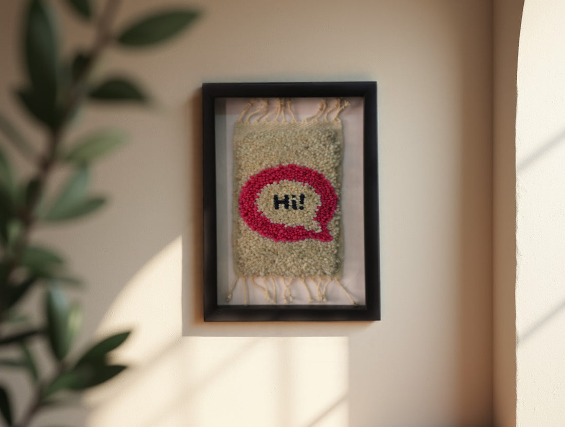 Pink Speech Bubble “Hi!” Moroccan Rug Wall Hanging – Framed Wool Art Decor