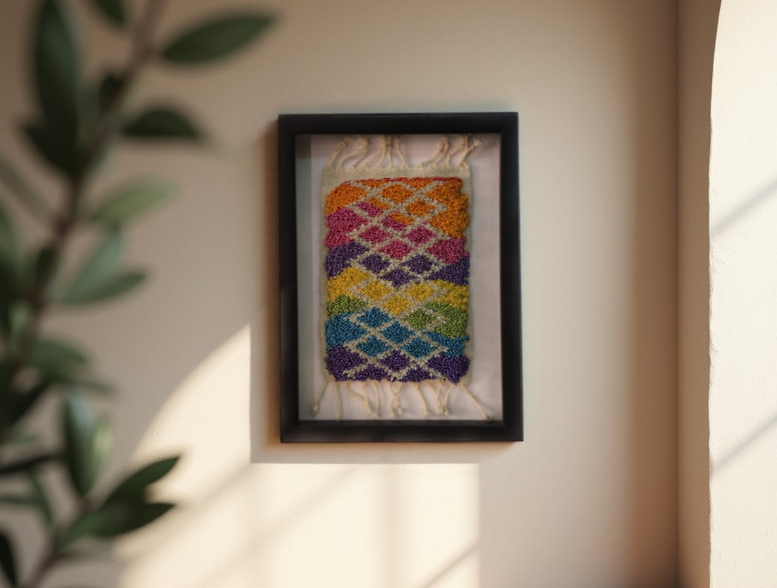 Rainbow Diamond Framed Wool Wall Hanging – Handwoven Colorful Textile Art (25x31cm)