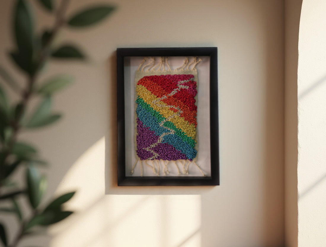 Rainbow Sunset Wool Wall Art – Handmade Framed Tapestry 25x31cm