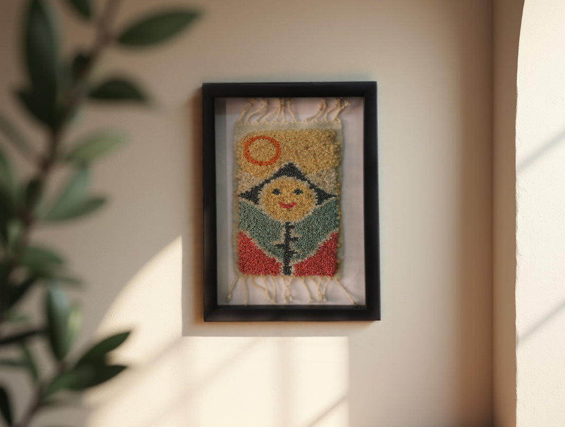 Sun & Smile Moroccan Rug Wall Art – Hand-Knotted Framed Textile (25x31 cm)