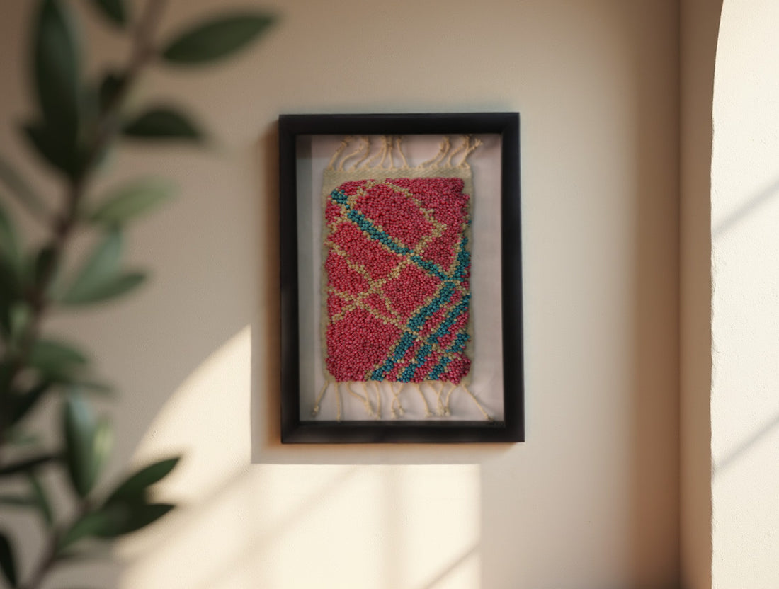 Framed Abstract Moroccan Rug Wall Art – Handwoven Texture in Red, Beige & Pink Wool...