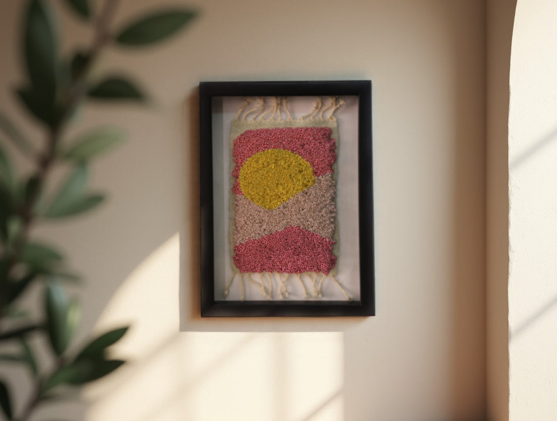 Framed Abstract Moroccan Rug Wall Art – Hand-Knotted Sunset Design (25x31 cm)